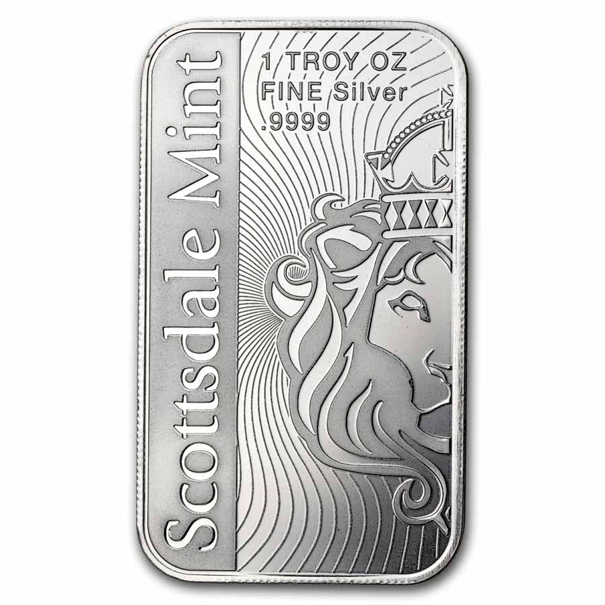 The obverse of the bar features a Scottsdale Mint lion's head logo on an intricately spiraling field like a vortex.