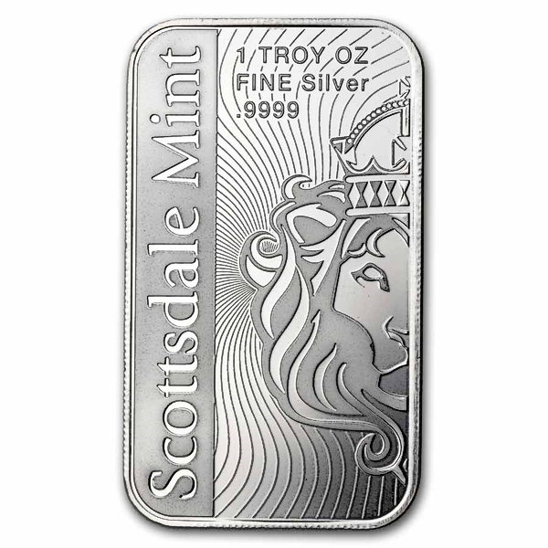 The reverse of the bar features "Scottsdale Mint" along the left side with wavy lines on the right along with the metal weight and purity and half of the Scottsdale lion's head logo.